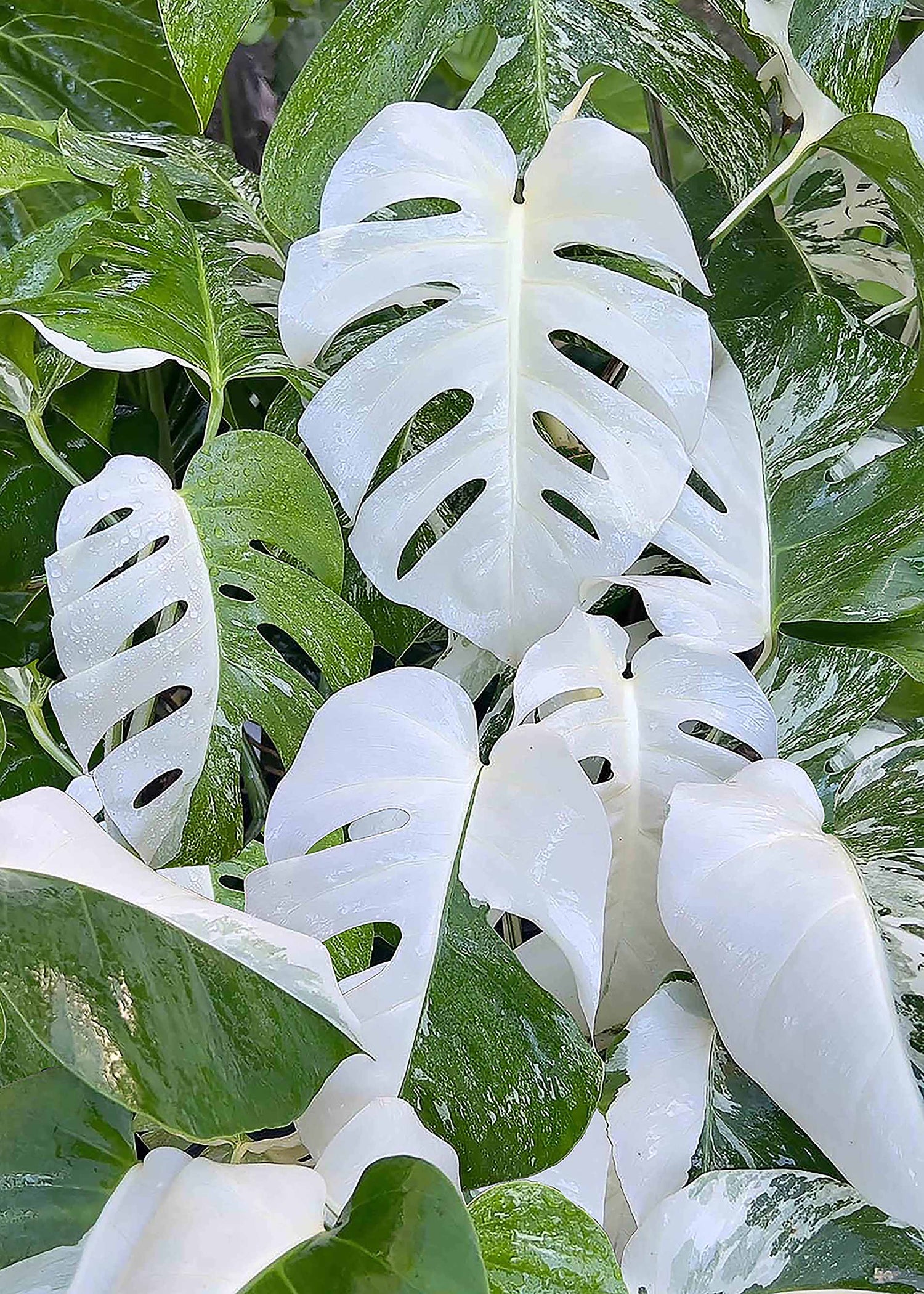 Images of Monstera deliciosa small form 'Borsigiana variegata' growing in the Araceae Cloud Forest